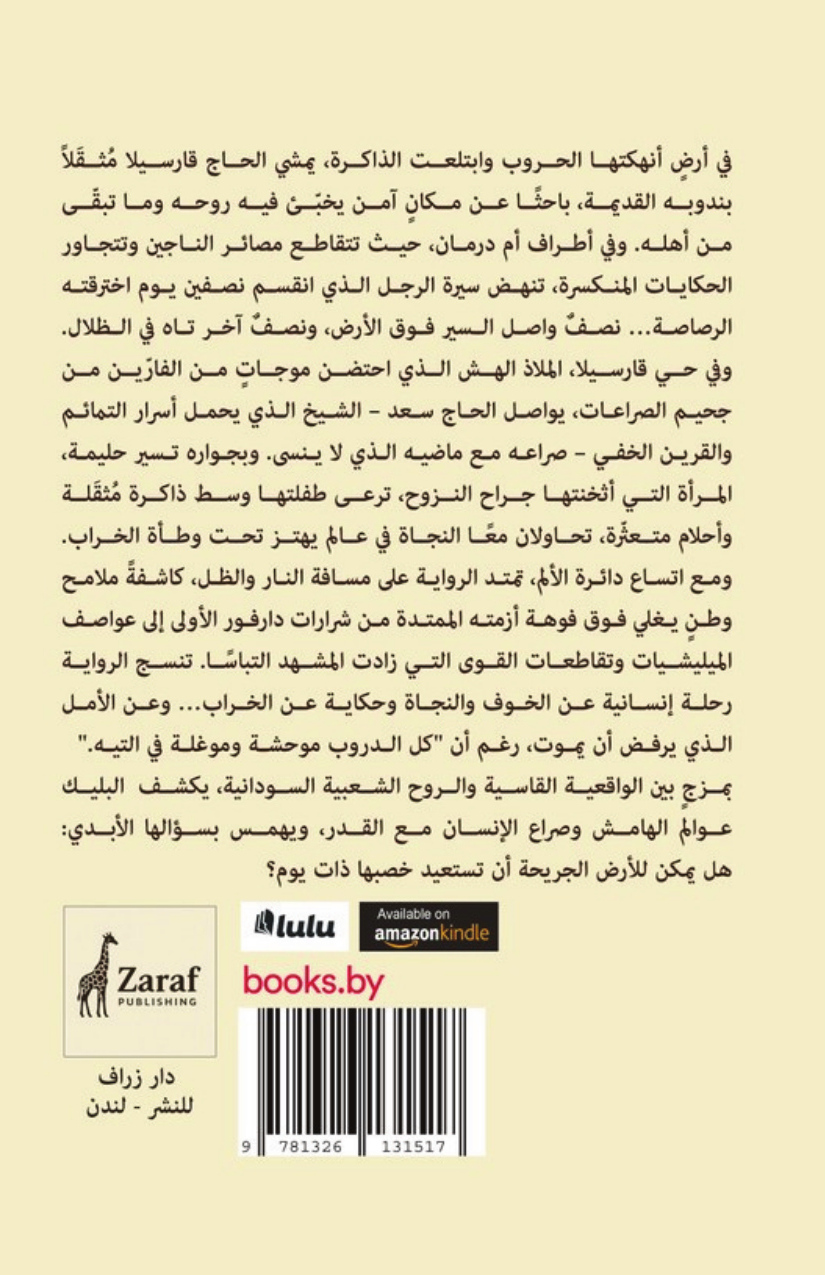 في أرضٍ أنهكتها الحروب وابتلعت الذاكرة، يمشي الحاج قارسيلا مُثقَلاً بندوبه القديمة، باحثًا عن مكانٍ آمن يخبّئ فيه روحه وما تبقّى من أهله. وفي أطراف أم درمان، حيث تتقاطع مصائر الناجين وتتجاور الحكايات المنكسرة، تنهض سيرة الرجل الذي انقسم نصفين يوم اخترقته الرصاصة… نصفٌ واصل السير فوق الأرض، ونصفٌ آخر تاه في الظلال