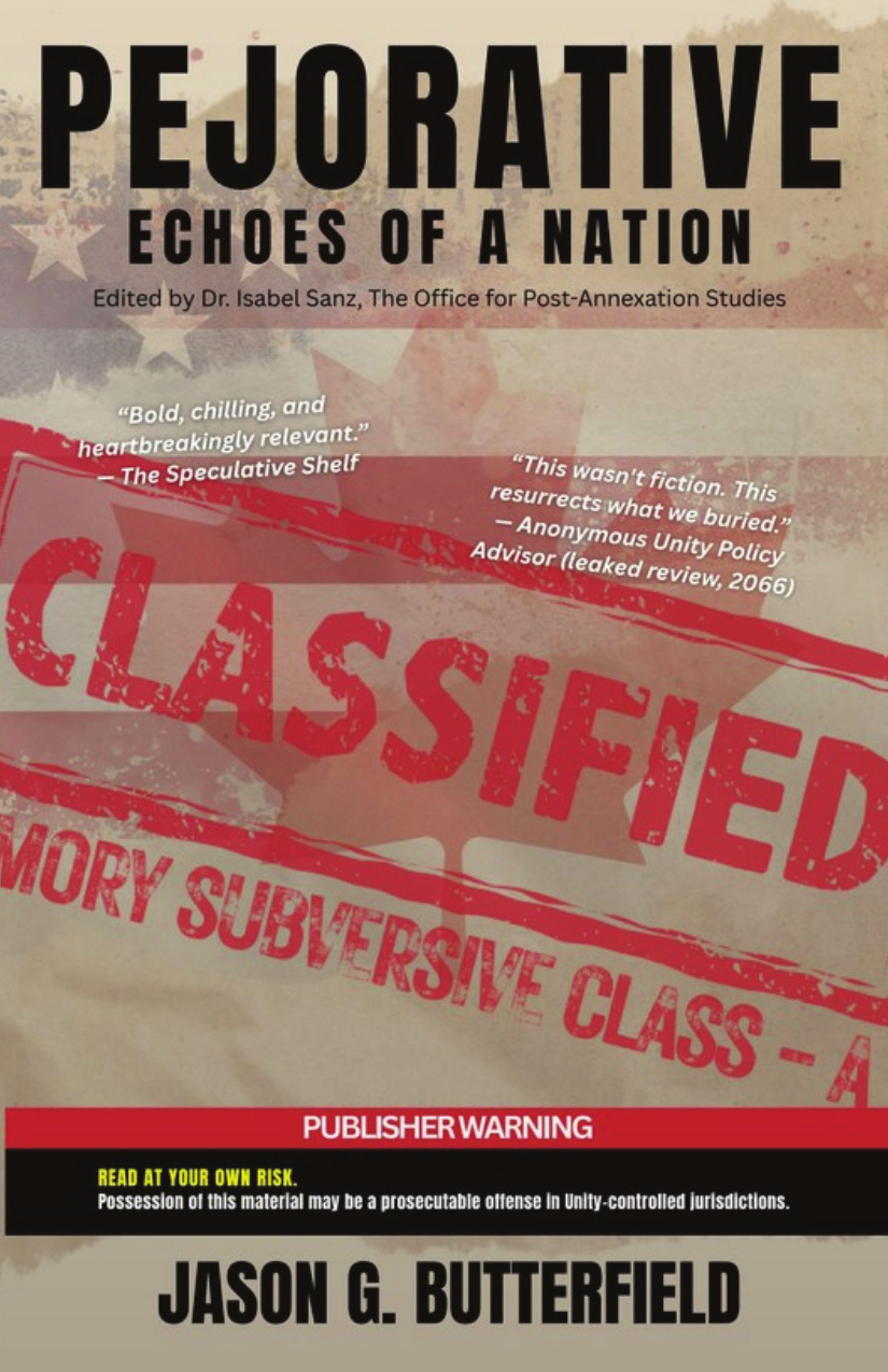 Pejorative: Echoes of a Nation is a hauntingly plausible speculative novel told through a fractured archive of testimonies, smuggled documents, corrupted broadcasts, and the reflections of a vanished resistance archivist. Set in a near-future Canada quietly annexed under the banner of continental “unity,” the story unfolds through recovered files curated by the last person who tried to remember out loud—Jason Butterfield.
